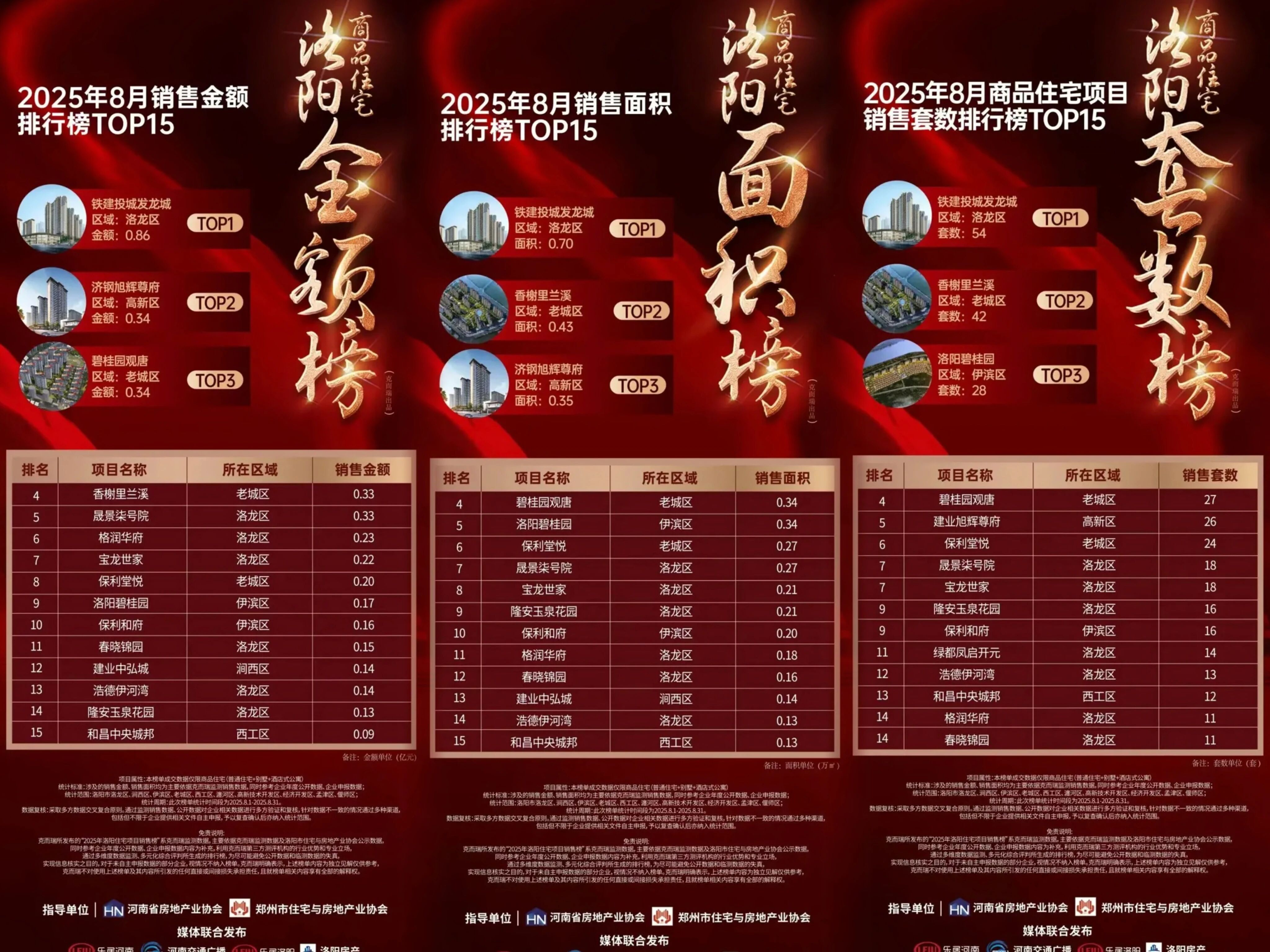 近日,克爾瑞河南區域洛陽市2025年8月商品住宅銷售榜單正式發布。鐵建投城發·龍城項目憑借卓越的產品力和市場認可度,一舉包攬銷售金額、銷售面積、銷售套數三大榜單榜首,成就“三冠王”佳績,展現出強勁的市場競爭力和品牌影響力。
