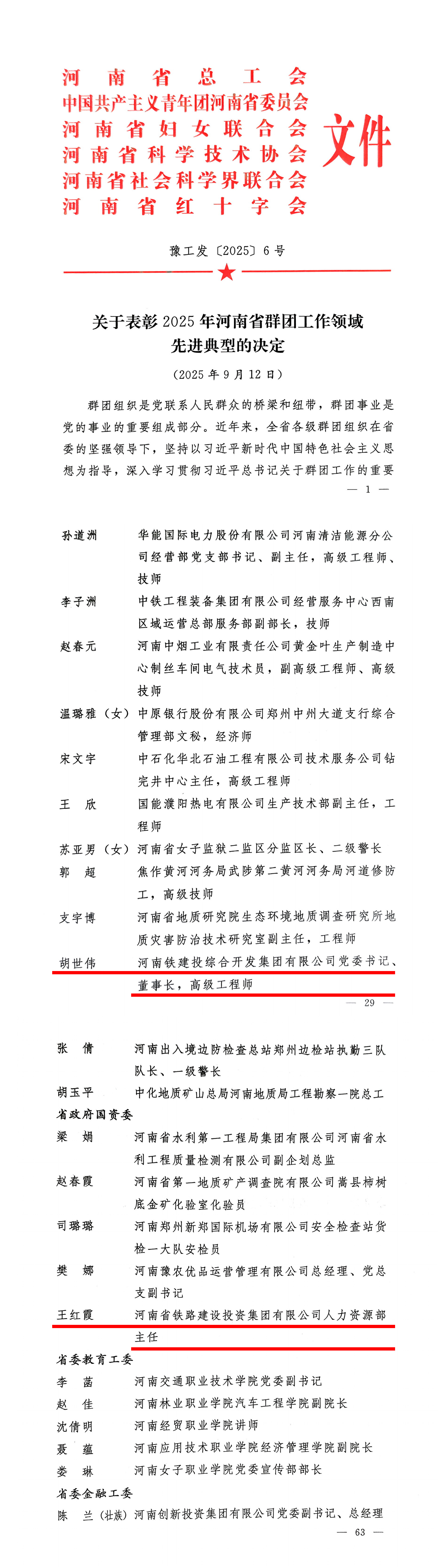 近日,河南省總工會等六部門聯(lián)合印發(fā)《關于表彰2025年河南省群團工作領域先進典型的決定》,河南鐵建投集團胡世偉同志被授予“河南省五一勞動獎”榮譽稱號,王紅霞同志被授予“河南省三八紅旗獎先進個人”榮譽稱號。