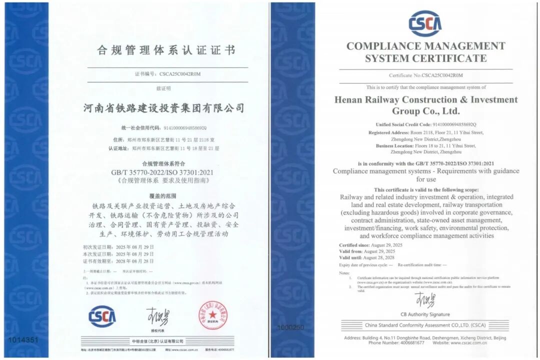 近日,河南鐵建投集團通過第三方權威機構的綜合評審,獲得ISO37301和GB/T35770合規管理體系國際國內雙認證,標志著集團依法合規管理水平和風險防控能力邁上新臺階、步入新征程。